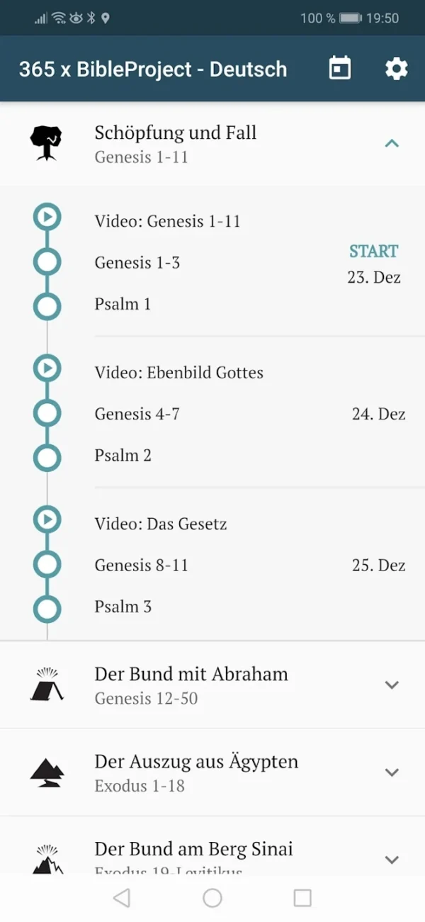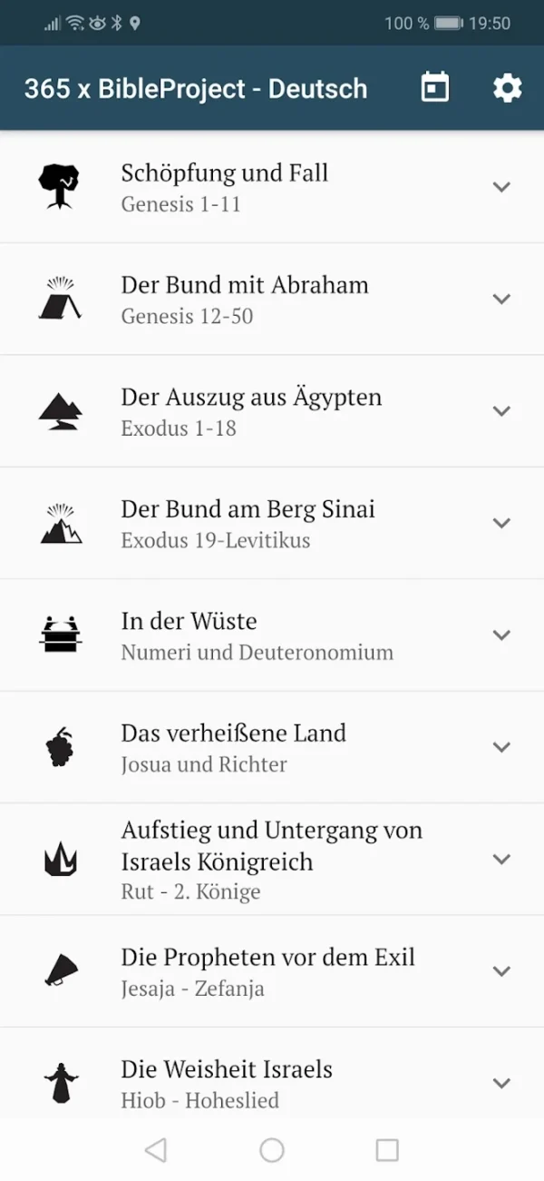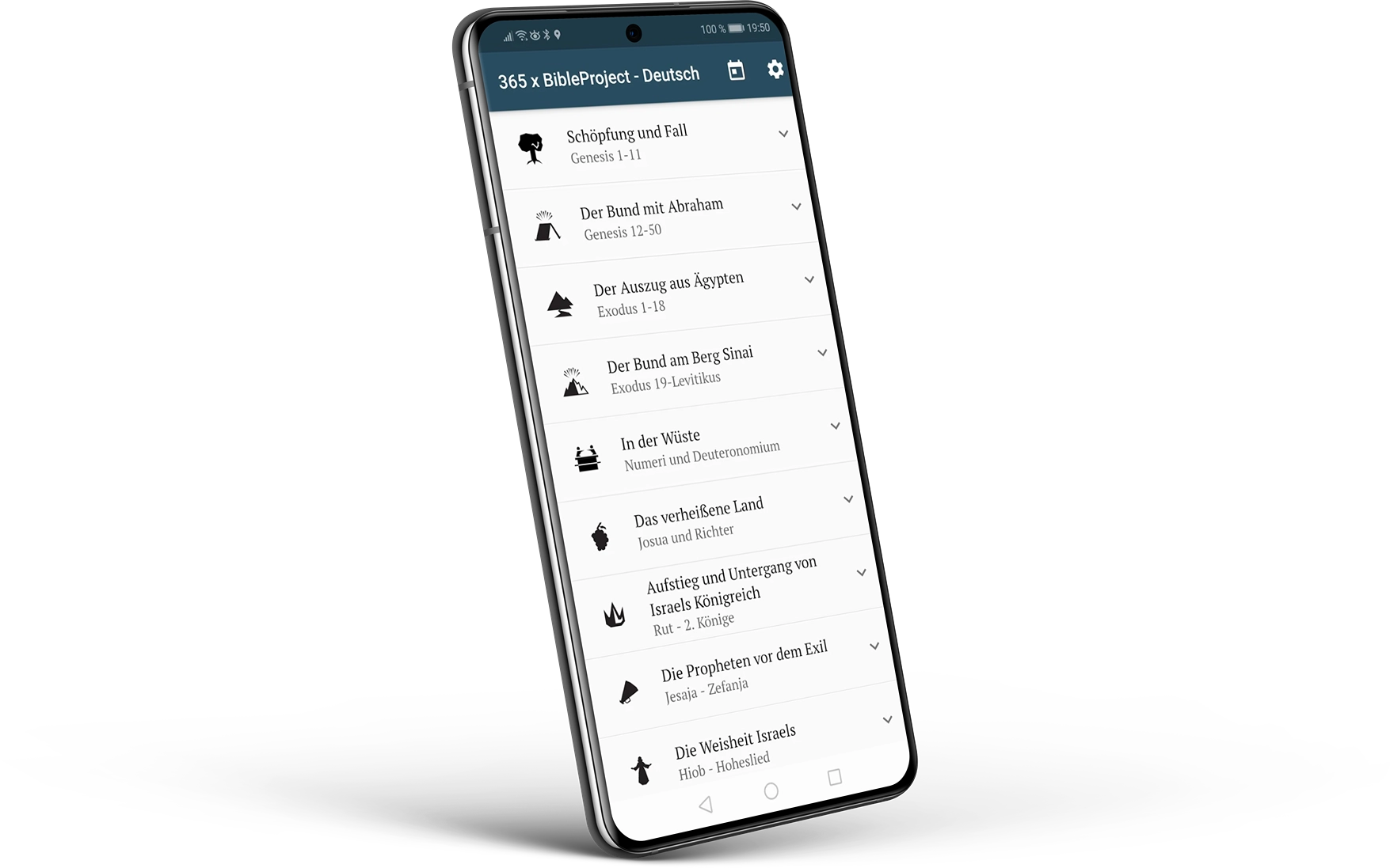 Mit der App “365 x BibleProject” kannst du in einem Jahr durch die ganze Bibel lesen. Begib dich auf deine eigene Bibelreise und lies täglich oder in deinem eigenen Tempo. Du kannst jederzeit starten.