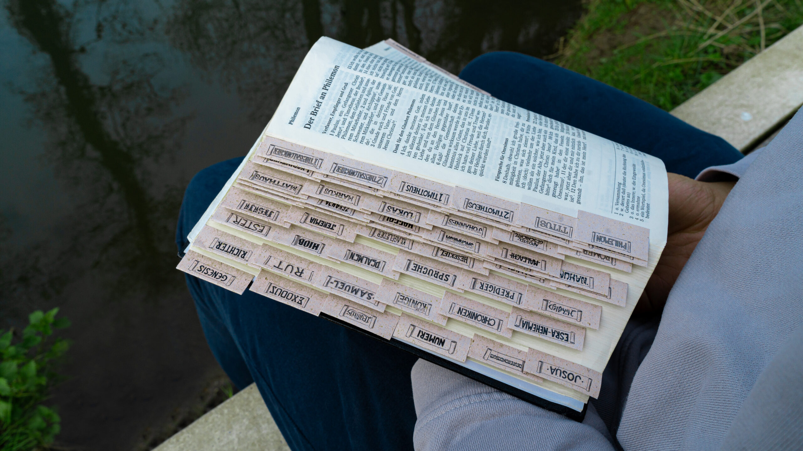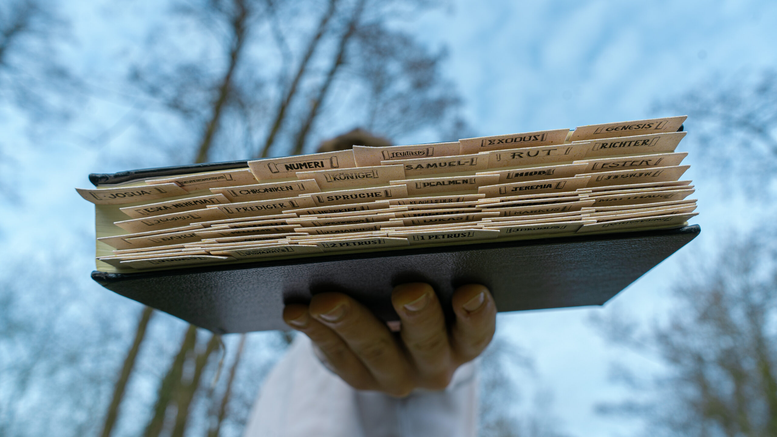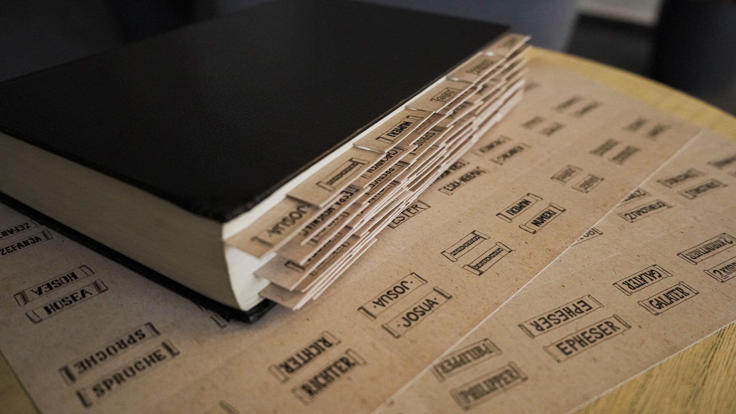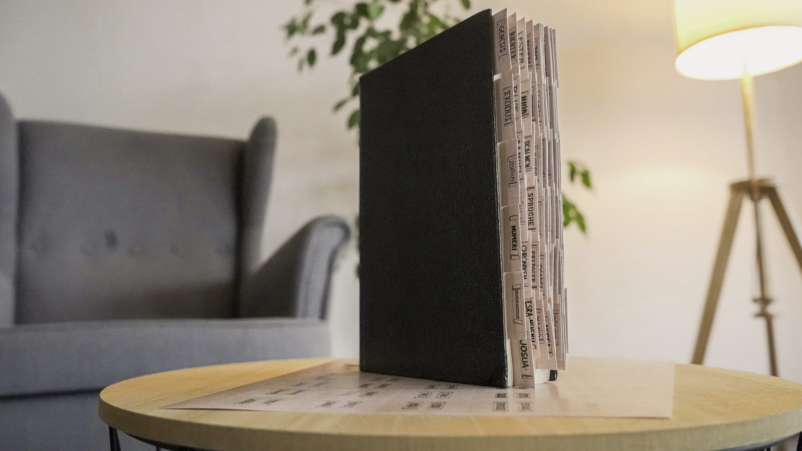 Die einzelnen Tabs für das Alte und Neue Testament sind alle gleich groß, bestehen aus verstärktem, vorgestanztem und selbstklebendem Papier; kein Schneiden, kein Kleben.