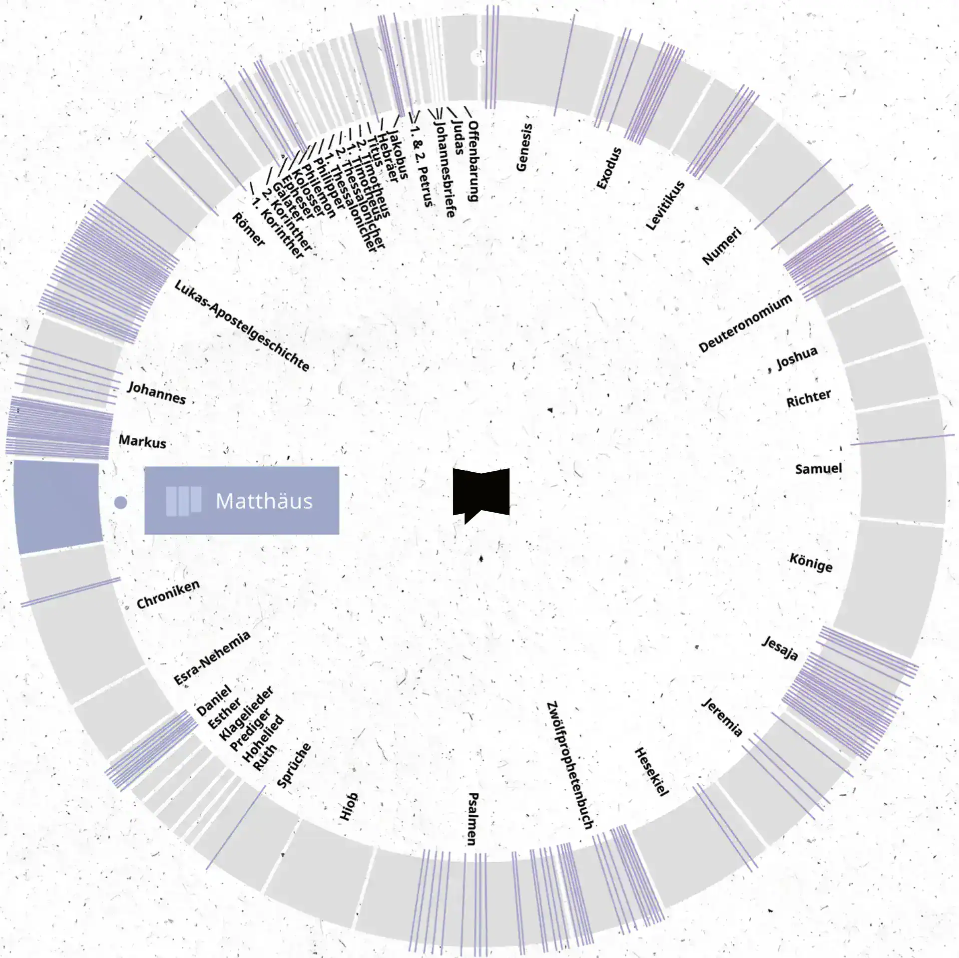 Dieser Kreis stellt alle Bücher der Bibel dar, wobei die einzelnen Segmente die Bücher repräsentieren. Die Markierungen zeigen Zitate oder Anspielungen aus diesen Büchern, die im Matthäusevangelium aufgegriffen werden, oder in denen sich auf Matthäus bezogen wird. Auf diese Weise zeigen wir, wie das Matthäusevangelium mit den anderen Büchern der Bibel verbunden ist und inwiefern innerbiblische Bezüge hergestellt werden. Erneut siehst du: Die Bibel ist eine zusammenhängende Geschichte, die zu Jesus führt.