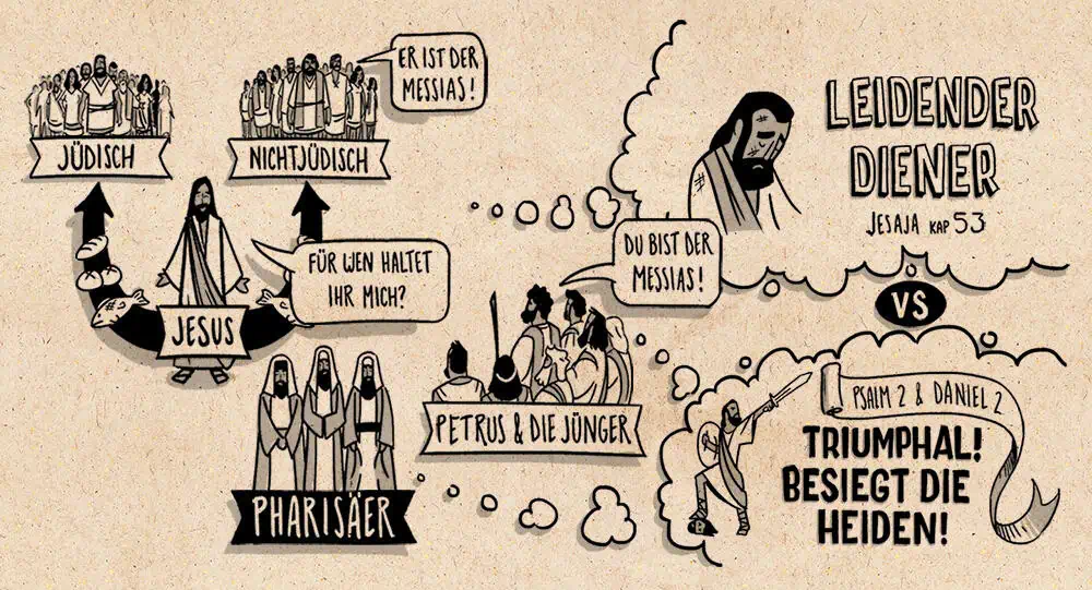 In den Kapiteln 16 und 17 lesen wir, dass sich Jesus zurückzieht und seinen Jüngern zu erklären beginnt, was es für ihn bedeutet, der Messias zu sein. Das passt mit all diesen Erwartungen nämlich nicht zusammen.
