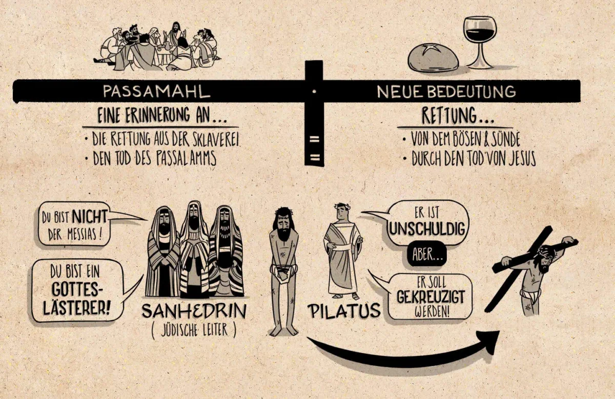 Während des Passafests zeigt Jesus seinen Jüngern die neuen Symbole, die für seinen Opfertod stehen, und wir erkennen die Parallele zum Exodus aus Ägypten. Obwohl Pilatus Jesus für unschuldig hält, gibt er dem Druck nach und lässt ihn kreuzigen.