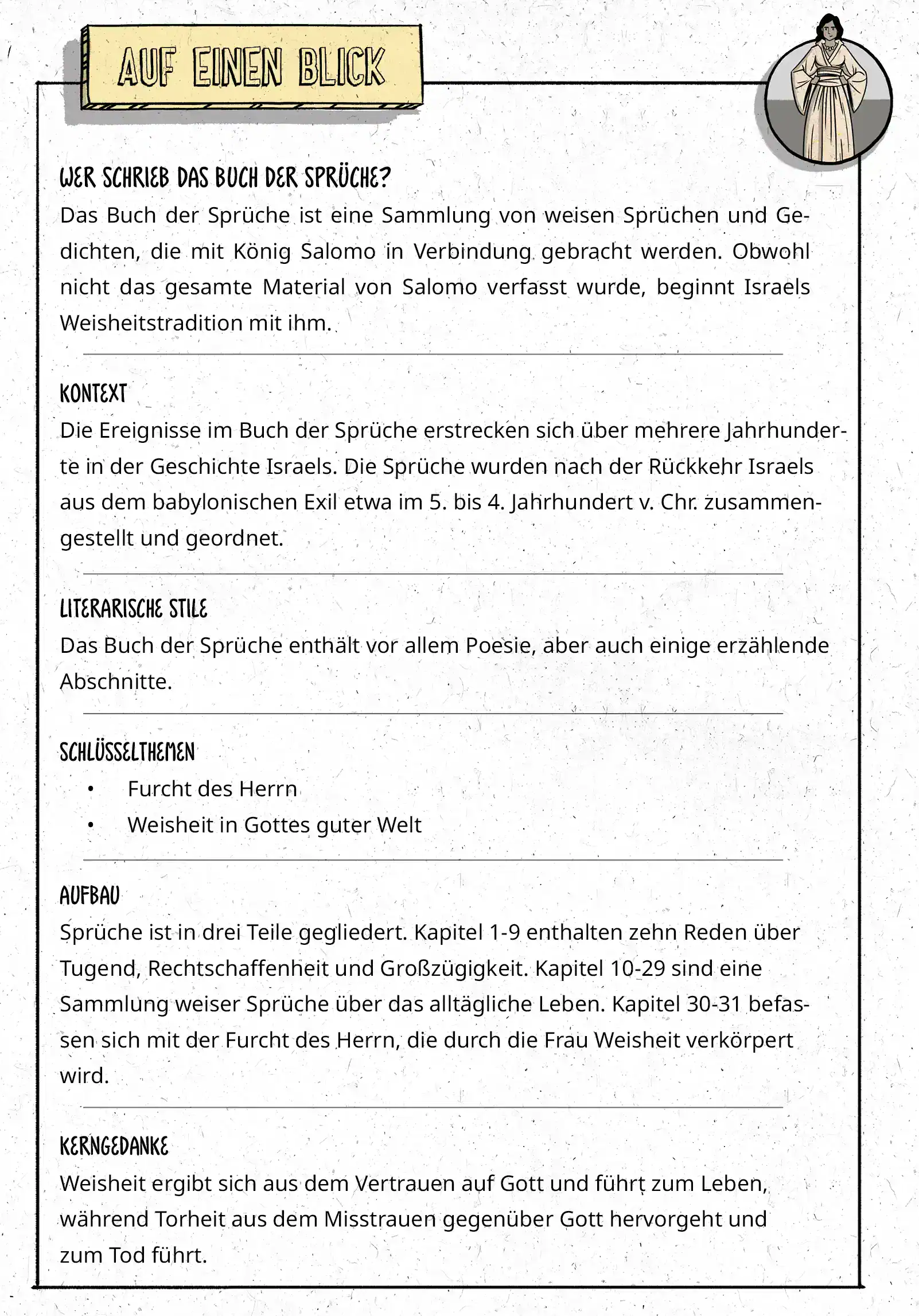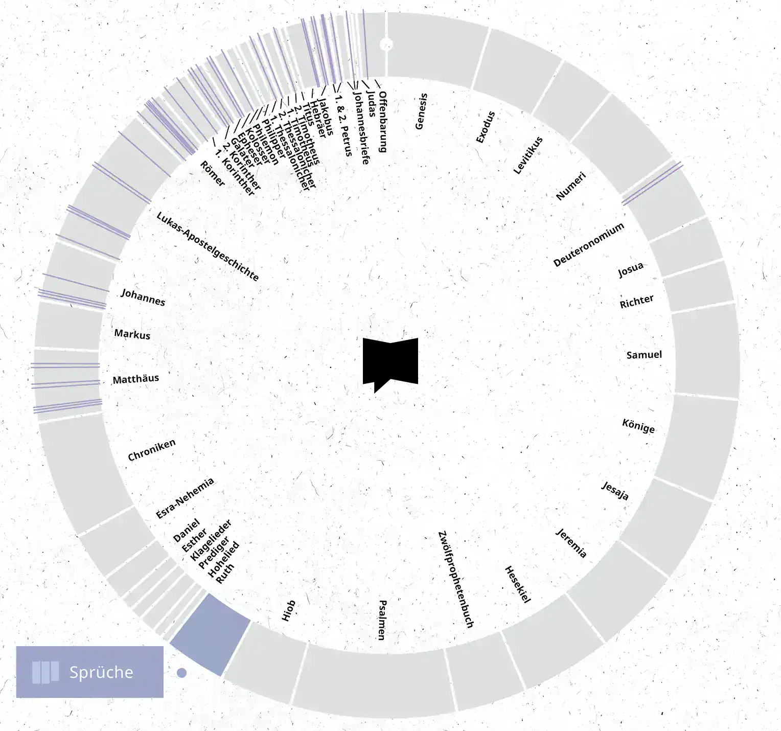 Dieser Kreis stellt alle Bücher der Bibel dar, wobei die einzelnen Segmente die Bücher repräsentieren. Die Markierungen zeigen Zitate oder Anspielungen aus diesen Büchern, die im Buch der Sprüche aufgegriffen werden, oder in denen sich auf Sprüche bezogen wird. Auf diese Weise zeigen wir, wie das Buch der Sprüche mit den anderen Büchern der Bibel verbunden ist und inwiefern innerbiblische Bezüge hergestellt werden. Erneut siehst du: Die Bibel ist eine zusammenhängende Geschichte, die zu Jesus führt.