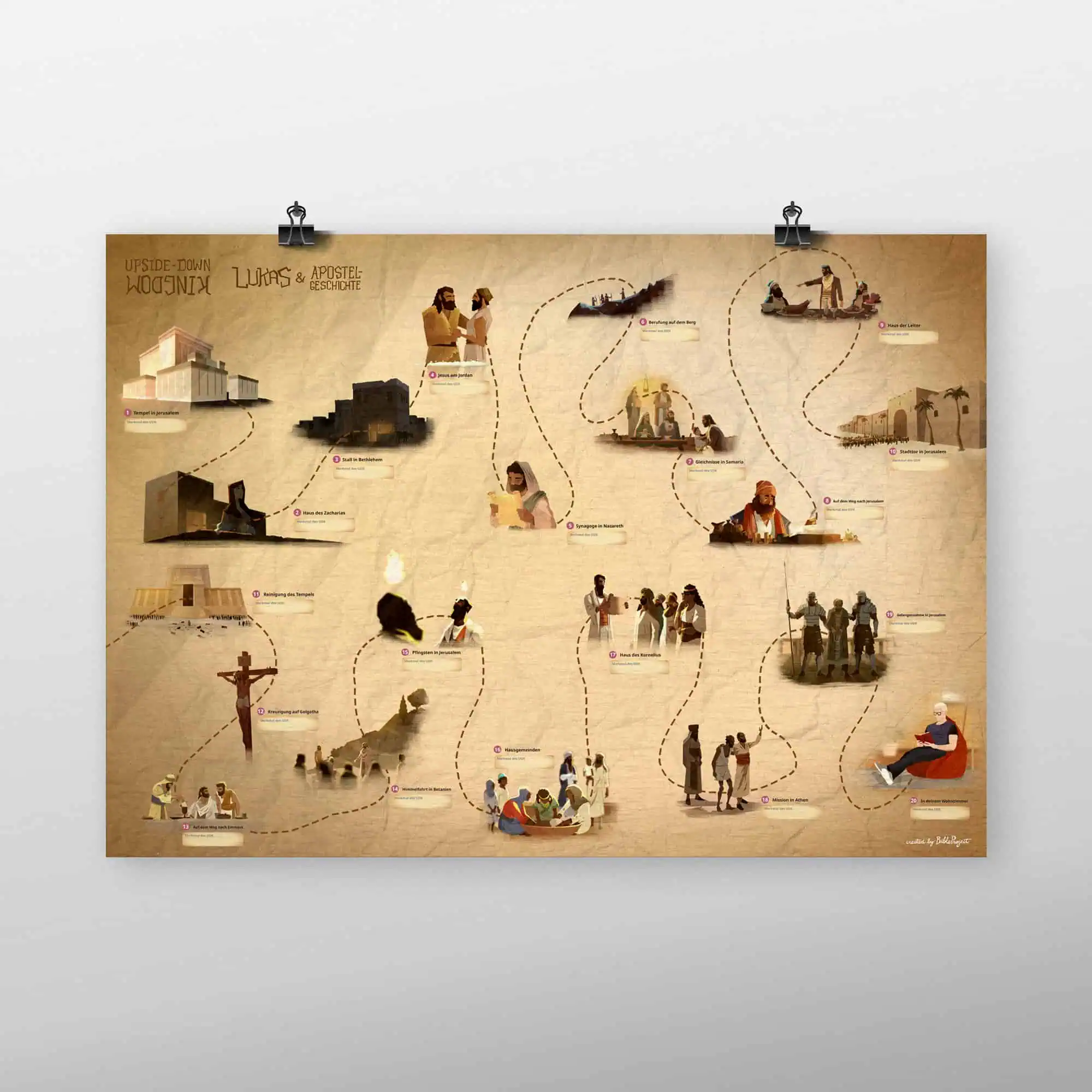 Dieses Poster ist als Ergänzung zum Begleitheft “Lukas-Apostelgeschichte” gedacht. Gehe mit deiner Kleingruppe oder alleine die einzelnen Stationen durch das Lukasevangelium und die Apostelgeschichte ab und trage in die Felder ein, welches Merkmal des “umgedrehten Königreichs” du an der jeweiligen Station erkannt hast.