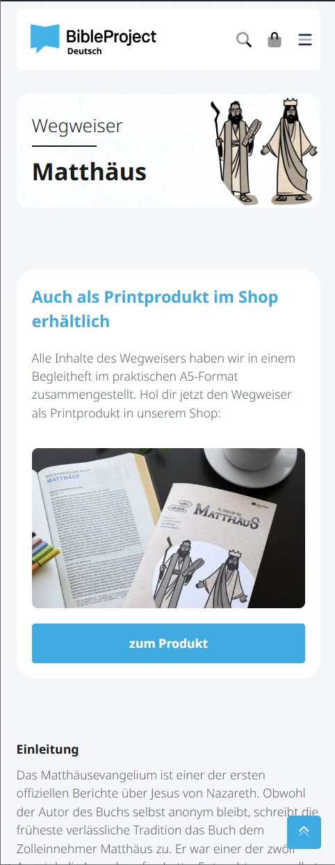 Der digitale Wegweiser steht kostenfrei zur Verfügung. Durch die Nutzung des Wegweisers entstehen uns (BibleProject – Deutsch) jedoch regelmäßige Kosten. Gerne freuen wir uns über deine – auch regelmäßige – Unterstützung. Die gedruckte Variante geben wir zum Selbstkostenpreis weiter.